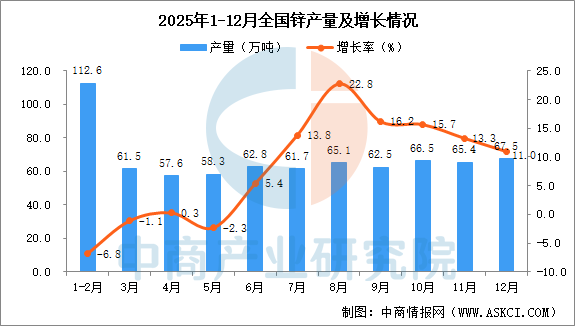 中商情报网讯:据中商产业研究院数据库,2025年12月全国锌当月产量与去年同期相比增长。2025年12月全国锌产量为67.5万吨,同比增长11.0%。2025年1-12月全国锌产量为752.8万吨,同比增长9.3%。