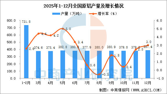 2025年12月全国原铝产量增长情况