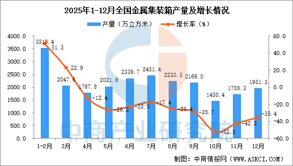 中商情报网讯:据中商产业研究院数据库,2025年12月全国金属集装箱当月产量与去年同期相比下降。2025年12月全国属集装箱产量为1951.3万立方米,同比下降35.4%。2025年1-12月全国金属集装箱产量为23564.5万立方米,同比下降21.0%。