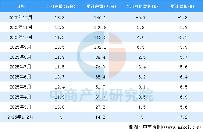 中商情报网讯:据中商产业研究院数据库,2025年12月全国电梯、自动扶梯及升降机当月产量与去年同期相比下降。2025年12月全国电梯、自动扶梯及升降机产量为13.3万台,同比下降0.7%。2025年1-12月全国电梯、自动扶梯及升降机产量为140.1万台,同比下降1.8%。