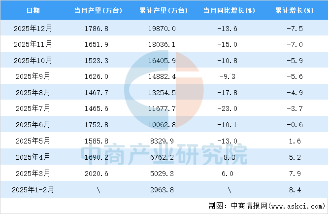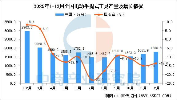 中商情报网讯:据中商产业研究院数据库,2025年12月全国电动手提式工具当月产量与去年同期相比下降。2025年12月全国电动手提式工具产量为1786.8万台,同比下降13.6%。2025年1-12月全国电动手提式工具产量为19870.0万台,同比下降7.5%。