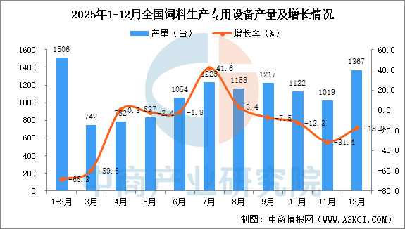 中商情报网讯:据中商产业研究院数据库,2025年12月全国饲料生产专用设备当月产量与去年同期相比下降。2025年12月全国饲料生产专用设备产量为1367台,同比下降18.0%。2025年1-12月全国饲料生产专用设备产量为11411台,同比下降31.5%。