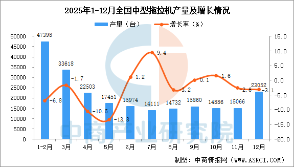 中商情报网讯:据中商产业研究院数据库,2025年12月全国中型拖拉机当月产量与去年同期相比下降。2025年12月全国中型拖拉机产量为23052台,同比下降3.1%。2025年1-12月全国中型拖拉机产量为228876台,同比下降6.0%。