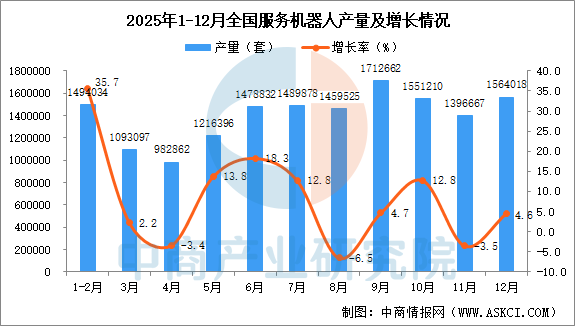 中商情报网讯:据中商产业研究院数据库,2025年12月全国服务机器人当月产量与去年同期相比增长。2025年12月全国服务机器人产量为156.40万套,同比增长4.6%。2025年1-12月全国服务机器人产量为1858.1万套,同比增长16.1%。