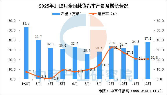 中商情报网讯:据中商产业研究院数据库,2025年12月全国载货汽车当月产量与去年同期相比增长。2025年12月全国载货汽车产量为37.8万辆,同比增长20.8%。2025年1-12月全国载货汽车产量为380.8万辆,同比增长13.9%。