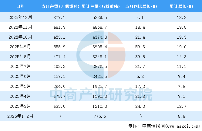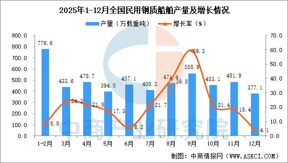 中商情报网讯:据中商产业研究院数据库,2025年12月全国民用钢质船舶当月产量与去年同期相比增长。2025年12月全国民用钢质船舶产量为377.1万载重吨,同比增长4.1%。2025年1-12月全国民用钢质船舶产量为5229.5万载重吨,同比增长18.2%。
