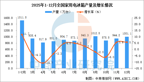 中商情报网讯:据中商产业研究院数据库,2025年12月全国家用电冰箱(家用冷冻冷藏箱)当月产量与去年同期相比增长。2025年12月全国家用电冰箱产量为1001.1万台,同比增长5.7%。2025年1-12月全国家用电冰箱产量为10924.4万台,同比增长1.6%。