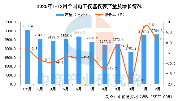 中商情报网讯:据中商产业研究院数据库,2025年12月全国电工仪器仪表当月产量与去年同期相比增长。2025年12月全国电工仪器仪表产量为2784.3万台,同比增长1.8%。2025年1-12月全国电工仪器仪表产量为27384.3万台,同比下降5.9%。
