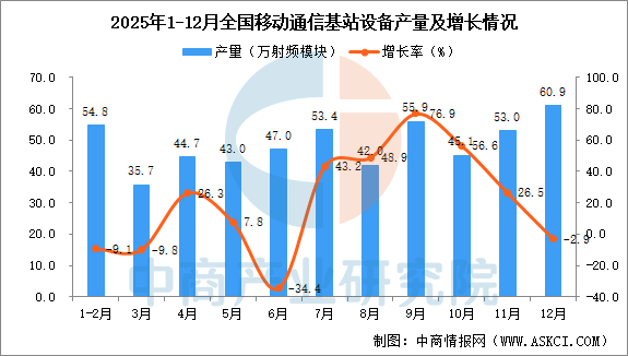 中商情报网讯:据中商产业研究院数据库,2025年12月全国移动通信基站设备当月产量与去年同期相比下降。2025年12月全国移动通信基站设备产量为60.9万射频模块,同比下降2.9%。2025年1-12月全国移动通信基站设备产量为536.4万射频模块,同比增长13.5%。