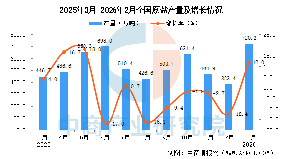 中商情报网讯:据中商产业研究院数据库,2026年1-2月全国原盐当月产量与去年同期相比增长。2026年1-2月全国原盐产量为720.2万吨,同比增长12.0%。