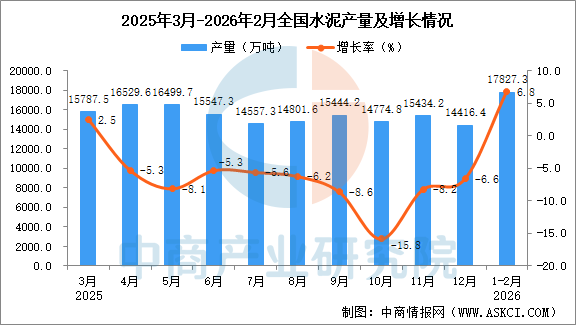 中商情报网讯:据中商产业研究院数据库,2026年1-2月全国水泥当月产量与去年同期相比增长。2026年1-2月全国水泥产量为17827.3万吨,同比增长6.8%。