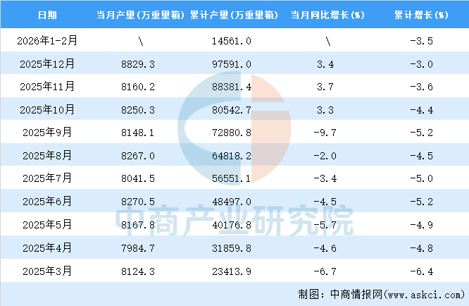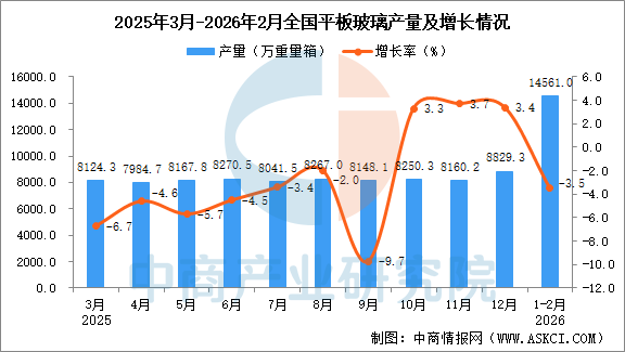 中商情报网讯:据中商产业研究院数据库,2026年1-2月全国平板玻璃当月产量与去年同期相比下降。2026年1-2月全国平板玻璃产量为14561.0万重量箱,同比下降3.5%。