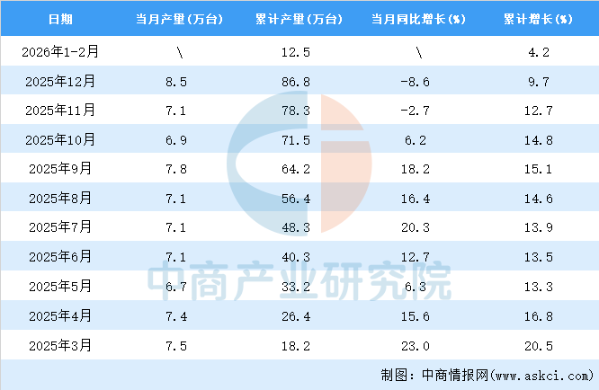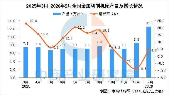 中商情报网讯:据中商产业研究院数据库,2026年1-2月全国金属切削机床当月产量与去年同期相比增长。2026年1-2月全国金属切削机床产量为12.5万台,同比增长4.2%。