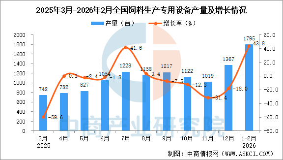 中商情报网讯:据中商产业研究院数据库,2026年1-2月全国饲料生产专用设备当月产量与去年同期相比增长。2026年1-2月全国饲料生产专用设备产量为1795台,同比增长43.8%。