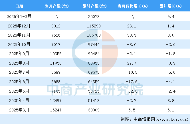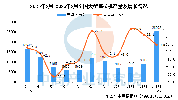 中商情报网讯:据中商产业研究院数据库,2026年1-2月全国大型拖拉机当月产量与去年同期相比增长。2026年1-2月全国大型拖拉机产量为25078台,同比增长9.4%。