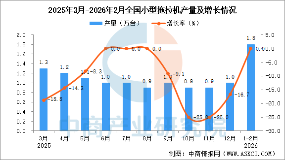 2026年1-2月全国小型拖拉机产量增长情况
