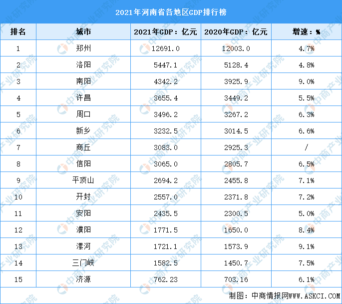 中商情报网讯:2021年河南全省地区生产总值58887.41亿元,按不变价格计算,同比增长6.3%,两年平均增长3.6%。从已公开的15个地区GDP总量来看,郑州突破万亿元位列第一。郑州之后,河南省还有7市的GDP突破3000亿元,成为省内发展的“中坚力量”,分别为洛阳、南阳、许昌、周口、新乡、商丘和信阳,它们依次从第2到第8。