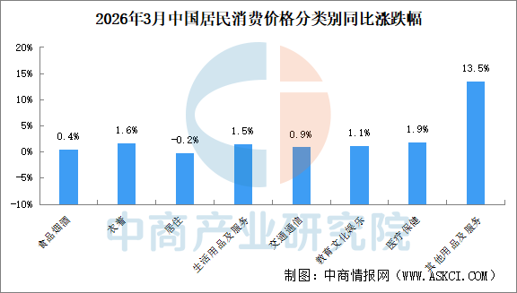 其他七大类价格同比六涨一降。其中,其他用品及服务、医疗保健、衣着价格分别上涨13.5%、1.9%和1.6%,生活用品及服务、教育文化娱乐、交通通信价格分别上涨1.5%、1.1%和0.9%;居住价格下降0.2%。