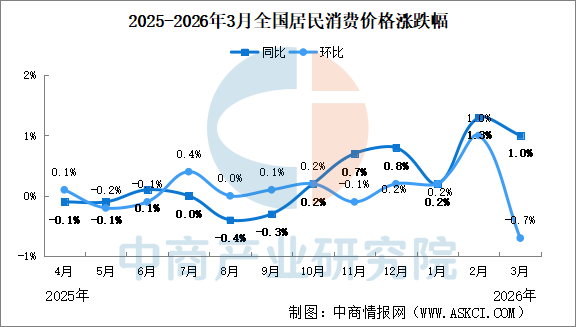 中商情报网讯:2026年3月份,全国居民消费价格同比上涨1.0%。其中,城市上涨1.1%,农村上涨0.9%;食品价格上涨0.3%,非食品价格上涨1.2%;消费品价格上涨1.3%,服务价格上涨0.8%。1—3月平均,全国居民消费价格比上年同期上涨0.9%。