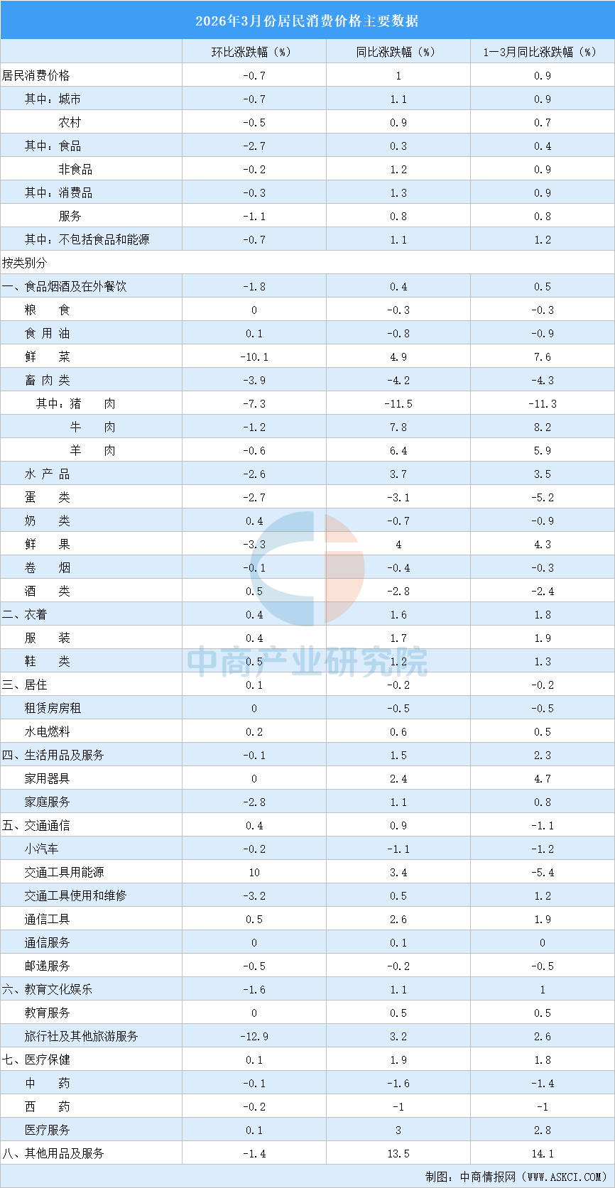 3月份,全国居民消费价格环比下降0.7%。其中,城市下降0.7%,农村下降0.5%;食品价格下降2.7%,非食品价格下降0.2%;消费品价格下降0.3%,服务价格下降1.1%。