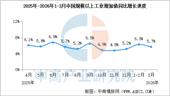 中商情报网讯:3月份,规模以上工业增加值同比实际增长5.7%(增加值增速均为扣除价格因素的实际增长率)。从环比看,3月份,规模以上工业增加值比上月增长0.28%。1—3月份,规模以上工业增加值同比增长6.1%。