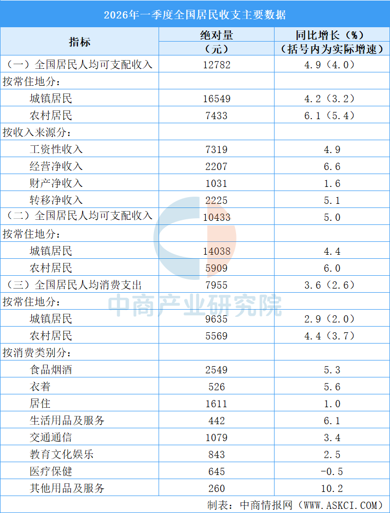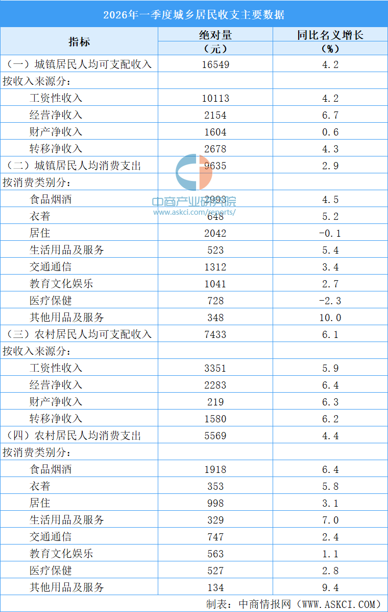 一季度,全国居民人均可支配收入12782元,比上年同期名义增长4.9%,扣除价格因素,实际增长4.0%。分城乡看,城镇居民人均可支配收入16549元,增长(以下如无特别说明,均为同比名义增长)4.2%,扣除价格因素,实际增长3.2%;农村居民人均可支配收入7433元,增长6.1%,扣除价格因素,实际增长5.4%。