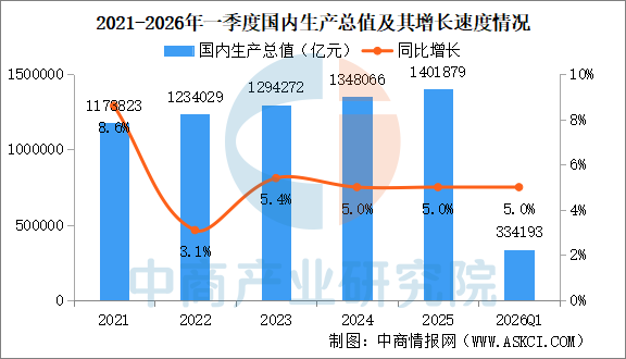 中商情报网讯:一季度,国民经济实现良好开局,发展韧性和活力进一步彰显。初步核算,一季度国内生产总值334193亿元,按不变价格计算,同比增长5.0%,比上年四季度加快0.5个百分点。分产业看,第一产业增加值11941亿元,同比增长3.8%;第二产业增加值116135亿元,增长4.9%;第三产业增加值206117亿元,增长5.2%。从环比看,一季度国内生产总值增长1.3%。