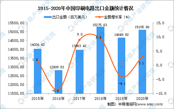 从金额方面来看,2020年印刷电路出口金额为15105.86百万美元,同比增长3.1%。