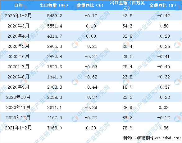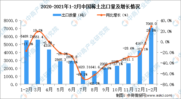 中商情报网讯:据中商产业研究院数据库显示,2021年1-2月中国稀土出口量为7068吨,同比增长28.8%。
