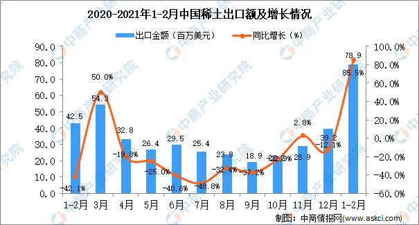 从金额方面来看,2021年1-2月中国稀土出口金额为78.9百万美元,同比增长85.5%。