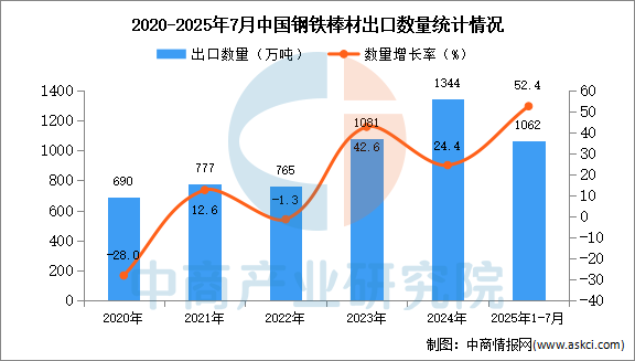 中商情报网讯:据中商产业研究院数据库显示,2024年中国钢铁棒材出口量1344万吨,同比增长24.4%。最新数据显示,2025年1-7月中国钢铁棒材出口量1062万吨,同比增长52.4%。