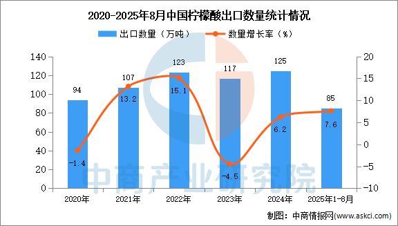 中商情报网讯:据中商产业研究院数据库显示,2024年我国柠檬酸出口量125万吨,同比增长6.2%。最新数据显示,2025年1-8月中国柠檬酸出口量85万吨,同比增长7.6%。