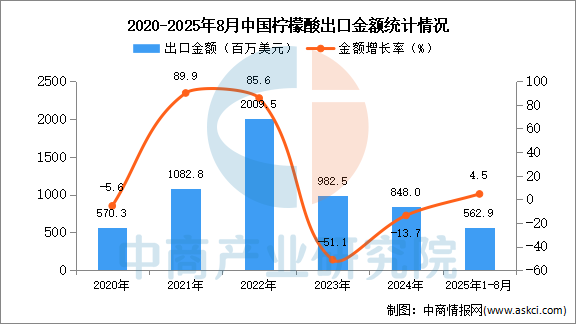 从金额方面来看,数据显示,2025年1-8月中国柠檬酸出口金额562.9百万美元,同比增长4.5%。