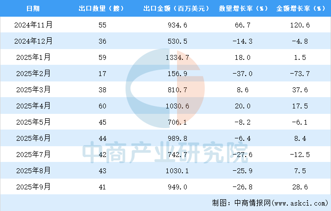 2025年9月中国散货船出口量及金额增长情况