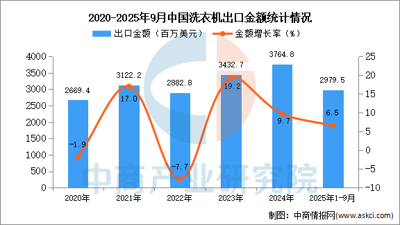 2025年9月中国洗衣机出口量及金额增长情况