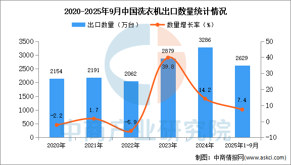 中商情报网讯:据中商产业研究院数据库显示,2024年中国洗衣机出口量3286万台,同比增长14.2%。最新数据显示,2025年1-9月中国洗衣机出口量2629万台,同比增长7.4%。