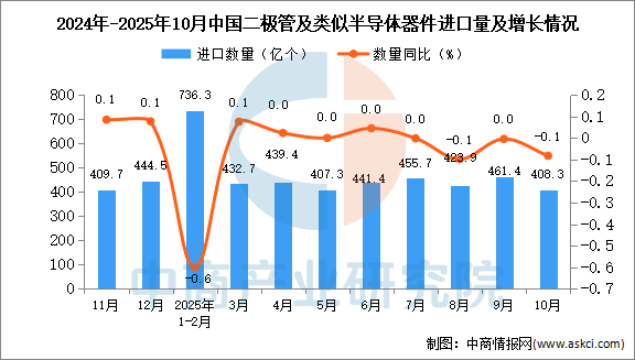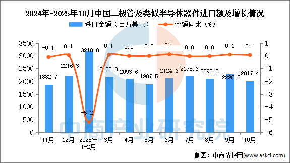 2025年10月中国二极管及类似半导体器件进口量及金额增长情况