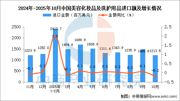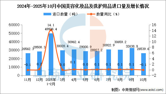 2025年10月中国美容化妆品及洗护用品进口量及金额增长情况