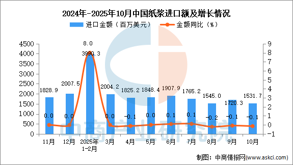 2025年10月中国纸浆进口量及金额增长情况
