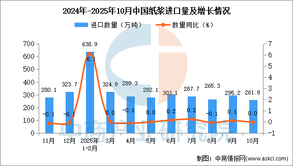 中商情报网讯:据中商产业研究院数据库显示,2025年10月中国纸浆进口量261.8万吨,同比增长持平;1-10月中国纸浆进口量2967.9万吨,同比增长4.8%。
