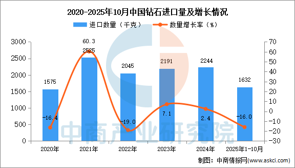 中商情报网讯:据中商产业研究院数据库显示,2024年中国钻石进口量2244万吨,同比增长2.4%。最新数据显示,2025年1-10月中国钻石进口量1632万吨,同比下降16%。