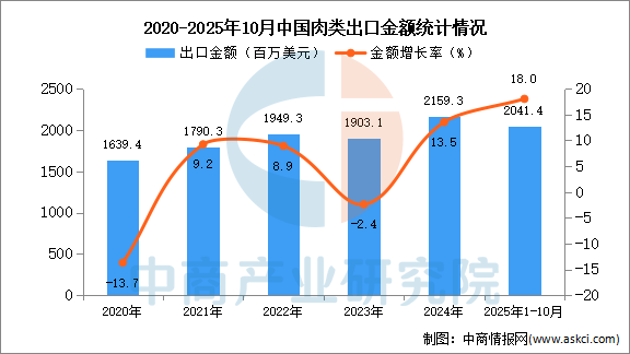 从金额方面来看,数据显示,2025年1-10月中国肉类(包括杂碎)出口金额2041.4百万美元,同比增长18%。