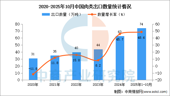 2025年10月中国肉类(包括杂碎)出口量及金额增长情况