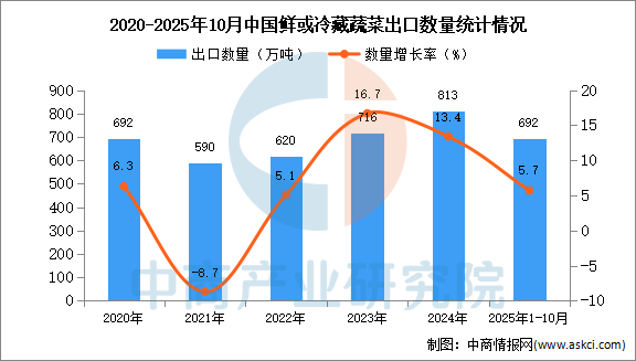 中商情报网讯:据中商产业研究院数据库显示,2024年我国鲜或冷藏蔬菜的出口量813万吨,同比增长13.4%。最新数据显示,2025年1-10月中国鲜或冷藏蔬菜出口量692万吨,同比增长5.7%。