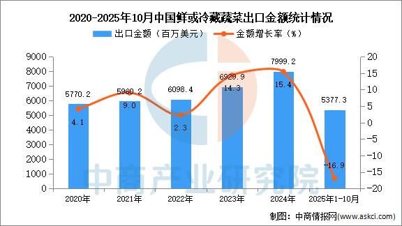 2025年10月中国鲜或冷藏蔬菜出口量及金额增长情况