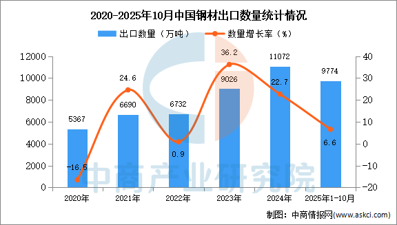 2025年10月中国钢材出口量及金额增长情况