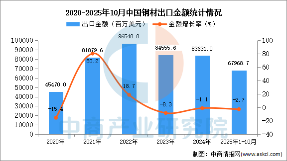 从金额方面来看,数据显示,2025年1-10月中国钢材出口金额67968.7百万美元,同比下降2.7%。