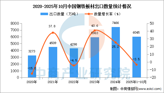 中商情报网讯:据中商产业研究院数据库显示,2024年中国钢铁板材出口量7466万吨,同比增长25.2%。最新数据显示,2025年1-10月中国钢铁板材出口量6045万吨,同比下降3.5%。