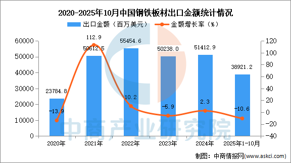 从金额方面来看,数据显示,2025年1-10月中国钢铁板材出口金额38921.2百万美元,同比下降10.6%。