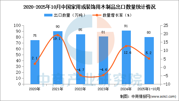 中商情报网讯:据中商产业研究院数据库显示,2024年我国家用或装饰用木制品出口量91万吨,同比增长12.6%。最新数据显示,2025年1-10月中国家用或装饰用木制品出口量80万吨,同比增长5.2%。